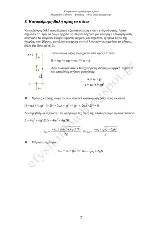 άξονα Μαπγαπίτα Τσόντος – Φςσικόρ - efysikimou.blogspot.gr 2 II. Κατακόρσφη Βολή προς τα κάτω Καηαθόξπθε βνιή νλνκάδεηαη ε εμαλαγθαζκέλε πηώζε ελόο ζώκαηνο. Απηό ζεκαίλεη όηη πξηλ ην ζώκα αξρίζεη λα πέθηεη δέρηεθε κηα δύλακε. Η δύλακε απηή αλάγθαζε ην ζώκα λα θηλεζεί έρνληαο αξρηθά κηα ηαρύηεηα, ε νπνία ιόγσ ηεο ύπαξμεο ηνπ βάξνπο, κεγαιώλεη κέρξη ηε ζηηγκή ιίγν πξηλ αθνπκπήζεη ην έδαθνο όπνπ θαη είλαη κέγηζηε. Έζησ ζώκα κάδαο m ξίρλεηαη από ύςνο Η. Τόηε: Β = mg mg = mα α = g Άξα ην ζώκα θάλεη επηηαρπλόκελε θίλεζε κε αξρηθή ηαρύηεηα θαη επνκέλσο ηζρύνπλ νη ζρέζεηο: u = u0 + gt y = u0t + ½ gt2 Χξόλνο θίλεζεο ζώκαηνο πνπ εθηειεί θαηαθόξπθε βνιή πξνο ηα θάησ Η = u0t + ½ gt2 2Η = 2u0t + gt2 gt2 + 2u0t - 2Η = 0 Γεπηεξνβάζκηα εμίζσζε. Γηα λα βξνύκε ηηο ξίδεο ηεο ππνινγίδνπκε ηε δηαθξίλνπζα. Γ = 4u0 2 - 4g(-2H) = 4u0 2 + 4g(2H) tνι = g Hguu 2 )2(44 2 00 tνι = g gHuu 22 00 Μέγηζηε ηαρύηεηα πηει = π0 + gtνι uηει = gHu 20