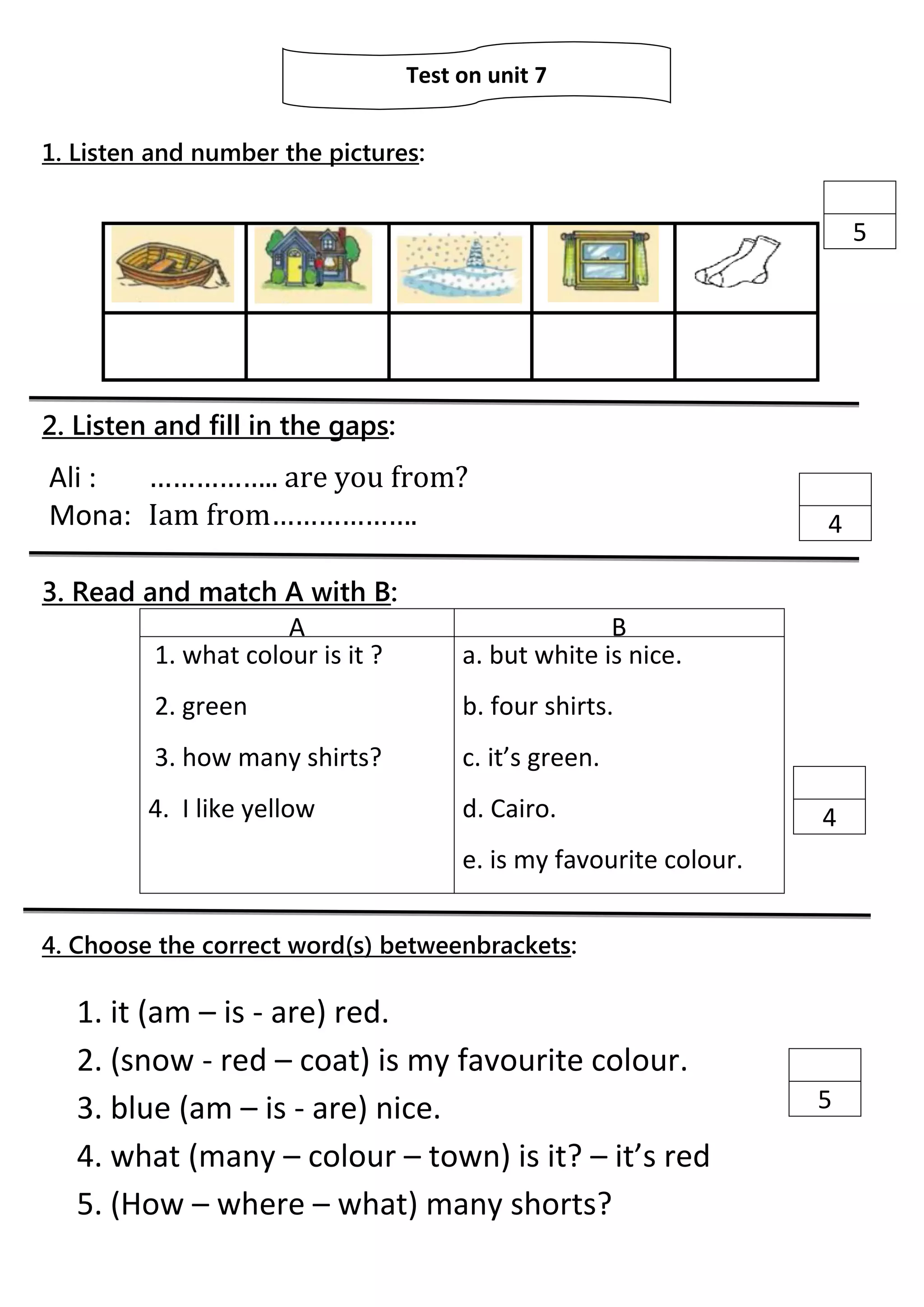 The document consists of various activities for language practice including listening exercises, matching questions, word choice tasks, and unscrambling words. It contains prompts for writing sentences and punctuation, along with a test for unit 7. Additionally, it includes sections for student information and well-wishes.