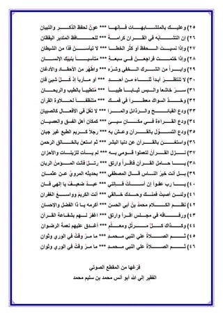 في هـــــــكرام رانـــــةً***للحــــــــــــافظِالمتدبرِاليقظانِ ٢٧(نسي وإذاـــــتَالــــــحفظَكث أوُالخ رَطـَــــا***تيأس الـَـــــــنّا من فذالشيطانِ ٢٨(ختم وإذاــــــــتَفراجِعَـــــنْفـــسبع يـــةٍ***متأسيـــــــــاًبنبيّاإلنس كــــــانِ ٢٩(وابــــــرأْالش منــــــركِالـــــوش خفيـرِّهِ***واطْھُاألحق من رــــادِواألدغانِ ٣٠(تنتظ الـــــــرْأبـداًثنــــــــاءًمــأح نـــــــدٍ***م أوـــأرباًإك ذُــــــلُّشيئٍفانِ ٣١(ســـــرْخاشعاًوالــــثي بســابـــــاًطيبـــــاً***مُتطيبــاًبالطيبِوالريحــــــانِ ٣٢(وخـــــــــذِالسواكَمعطــــــــراًفيفمــــك***متنظفـــــــاًلحــــــالوةِالقرآنِ ٣٣(ودعِالقبائــــــــــحَوالــــرذائلَوالمِـــــــرَا***تغ الْلُاألفع فيـــــالِكالصبيانِ ٣٤(ودعِالقــــــراءةَفــــمك يــــــــانٍسيــــئٍ***كمكانِأھلِالفسقِوالعصيـــانِ ٣٥(ودعِالتســـــــوُّبالق لــــــــرآنِوعــشْبهِ***رجالًكـــــريمَالطبعِغيرَجبانِ ٣٦(واستغـــــــــنَبالقـــــــرآنِال دنيا عنبشر***استعن ثمْبالخـــــــالقِالرحمنِ ٣٧(نـــــــزلَالقــــــرآنُق لتعملواــــب وميـــهِ***ي لمـــــأتِللزينــــاتِواألحزانِ ٣٨(يـــــــــح اــــاملَالقـــــرآنِفاقـــرأْوارتقِ***رتــــلْالم فأنتــــــؤمنُالربانِ ٣٩(بــــخير أنت لُالنــــاسِقـــــالَالمصطفي***بحديثِالمروي هِّعــعثم نـــانِ ٤٠(يــــــــعف رب اـواًأ إنســــــــأتُفـــــإنني***عبــــدٌضعيـــفٌف إلھي ياـــانِ ٤١(ولئــــأصبت نُفمنــــكَوحـــــدَخ كـــالقي***الكريم أنتُوواســــــعُالغفرانِ ٤٢(نظــــــمَالكـــــــــالمَمحمدُبنُأالحسن بي***أكرِي مهــالفضل ذا اِواإلحسانِ ٤٣(ورفـــــــــــاقَمج في هــــلسِاقـــوارتق رأِ***اغفرْلــــبشف ھمــاعةِالقـــرآنِ ٤٤(وكــــــــذاكِكـــــــلُّمـــــــــرتِّلٍومعــــــلِّمٍ***أغـــدِنعمة عليھم قَالرضـوانِ ٤٥(ثــــــــــالص مــــــــالةُعليم النبيـــحمــدٍ***م ماــوقت رٌ ّوثوان الوري فيِ ٤٦(ثــــــــــالص مــــــــالةُم النبي عليـــحمــدٍ***م ماــوقت رٌ ّوثوان الوري فيِ فرّالصوتي المقطع من غھا محمد سليم بن محمد أنس أبو ﷲ إلي الفقير