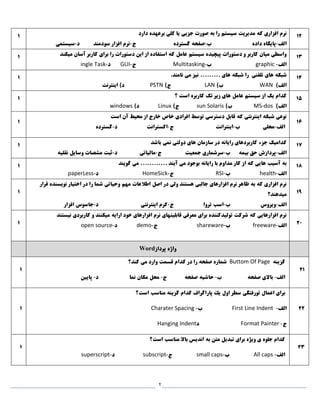 به را سيستم مديريت که افزاری نرمدارد برعهده کلی يا الف-داده پايگاهب-گسترده صفحهج-سودمند افزار نرمد-سيستمی 12 1 ميکند آسان کاربر برای را دستورات اين از استفاده که عامل سيستم پيچيده دستورات و کاربر ميان واسطی الف-graphicب-Multitaskingج-GUIد-ingle Task 13 1 های شبکهتلفنی.نامند می نيز ......... های شبکه را )الفWAN)بLAN)جPSTNاينترنت )د 14 1 ؟ است کاربره تک زير های عامل سيستم از يک کدام )الفMS-dos)بsun Solarisج)Linux)دwindows 15 1 است آن محيط از خارج خاص افرادی توسط دسترسی قابل که اينترنتی شبکه نوعی الف-ب محلی-اينترانتج-اکسترانتد-گسترده 16 1 باشد نمی دولتی های سازمان در رايانه کاربردهای جزء کداميک الف-بيمه حق پردازشب-جمعيت سرشماریج-مالياتید-نقليه وسايل مشصات ثبت 17 1 گويند می ............ آيند می بوجود رايانه با مداوم کار از که هايی آسيب به الف-healthب-RSIج-HomeSickد-paperLess 18 1 در ولی هستند جالبی افزارهای نرم ظاهر به که افزاری نرمقرار نويسنده اختيار در را شما وحياتی مهم اطالعات اصل ميدهند؟ الف-ويروسب-تروا اسبج-اينترنتی کرمد-افزار جاسوس 19 1 نيستند کاربردی و ميکنند ارايه خود افزارهای نرم قابليتهای معرفی برای توليدکننده شرکت که افزارهايی نرم الف-freewareب-sharewareج-demoد-open source 20 پرداز واژهWord 1 گزينهButtom Of Pageکند؟ می وارد قسمت کدام در را صفحه شماره الف-صفحه باالیب-صفحه حاشيهج-نما مکان محلد-پايين 21 1 تورفتگی اعمال برایاست؟ مناسب گزينه کدام پاراگراف يك اول سطر الف-First Line Indentب-Charater Spacing ج-Format PainterدHanging Indent 22 1 است؟ مناسب باال انديس به متن تبديل برای ويژه ی جلوه کدام الف-All capsب-small capsج-subscriptد-superscript 23