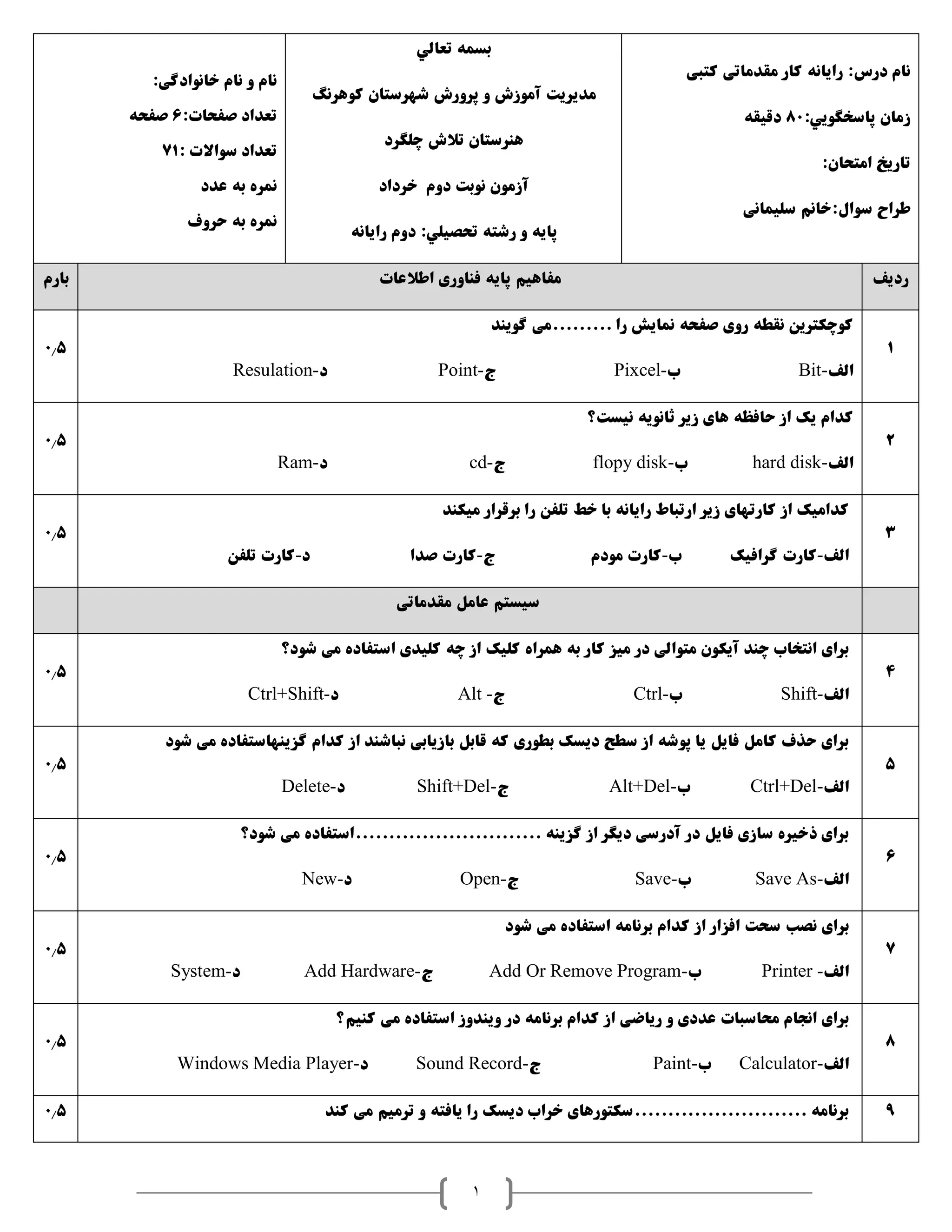 نام :صفحات تعداد6صفحه : سواالت تعداد71 عدد به نمره حروف به نمره تعالي بسمه شهرستان پرورش و آموزش مديريتکوهرنگ چلگرد تالش هنرستان نوبت آزموندومخرداد :تحصيلي رشته و پايهرايانه دوم :درس ناممقدماتی کار رايانهکتبی :پاسخگويي زمان80دقيقه :امتحان تاريخ سوال:خانم طراحسليمانی بارم اطالعات فناوری پايه مفاهيم رديف 0.5 گويند .........می را نمايش صفحه روی نقطه کوچکترين الف-Bitب-Pixcelج-Pointد-Resulation 1 0.5 نيست؟ ثانويه زير های حافظه از يک کدام الف-hard diskب-flopy diskج-cdد-Ram 2 0.5 زير کارتهای از کداميکميکند برقرار را تلفن خط با رايانه ارتباط الف-گرافيک کارتب-مودم کارتج-صدا کارتد-تلفن کارت 3 مقدماتی عامل سيستم 0.5 شود؟ می استفاده کليدی چه از کليک همراه به کار ميز در متوالی آيکون چند انتخاب برای الف-Shiftب-Ctrlج-Altد-Ctrl+Shift 4 0.5 شود می گزينهاستفاده کدام از نباشند بازيابی قابل که بطوری ديسک سطح از پوشه يا فايل کامل حذف برای الف-Ctrl+Delب-Alt+Delج-Shift+Delد-Delete 5 0.5 شود؟ می ............................استفاده گزينه از ديگر آدرسی در فايل سازی ذخيره برای الف-Save Asب-Saveج-Openد-New 6 0.5 شود می استفاده برنامه کدام از افزار سحت نصب برای الف-Printerب-Add Or Remove Programج-Add Hardwareد-System 7 0.5 ويندوز در برنامه کدام از رياضی و عددی محاسبات انجام برایکنيم؟ می استفاده الف-Calculatorب-Paintج-Sound Recordد-Windows Media Player 8 0.5 کند می ترميم و يافته را ديسک خراب ..........................سکتورهای برنامه 9