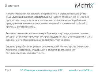 Документ описывает автоматизированную систему учета «1с: селекция в животноводстве. крс», предназначенную для управления зоотехнической и племенной работой с крупным рогатым скотом. Система обеспечивает учет поголовья, кормов, ветеринарных мероприятий и позволяет формировать специализированную отчетность, улучшая качество управленческих решений и снижая затраты. Ключевые преимущества включают уменьшение затрат на 10% в первые три месяца и сокращение времени ввода данных на 50%.