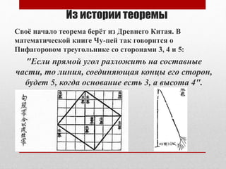 Документ обсуждает теорему Пифагора, её исторические корни, начиная с Древнего Китая и Египта. Приводятся алгебраическая и геометрическая формулировки теоремы, а также несколько различных доказательств. Отмечается, что теорема сохраняет свою актуальность и точность на протяжении веков.