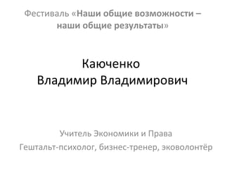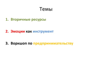 Документ представляет собой описание мероприятий, организованных Владимиром Каюченко, включая темы вторичных ресурсов, эмоций и воркшопа по предпринимательству. Рассматриваются проблемы утилизации отходов в России и за рубежом, а также роли эмоций в побуждении к действию. Также представлены советы по раздельному сбору и переработке отходов, а также инструкции для группы на воркшопе.