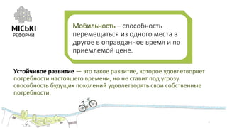 Документ описывает концепцию устойчивой мобильности для Харькова, подчеркивая необходимость удовлетворения потребностей населения в перемещении при минимальных затратах ресурсов и загрязнении. Также рассматриваются перспективные проекты, включая реконструкцию трамвайных путей, увеличение пропускной способности дорог и развитие велосипедной инфраструктуры. Основные цели заключаются в улучшении транспортной системы города с учетом экологических и социальных факторов.