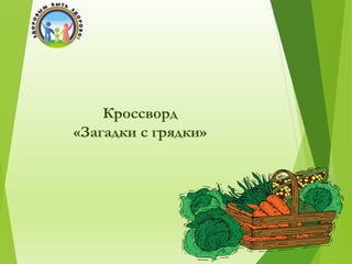 Документ представляет собой кроссворд с загадками на тему овощей и фруктов. Участникам необходимо разгадать загадки и вписать ответы в соответствующие поля, составив в итоге ключевое слово. Приведены примеры загадок и готовые ответы по горизонтали и вертикали.