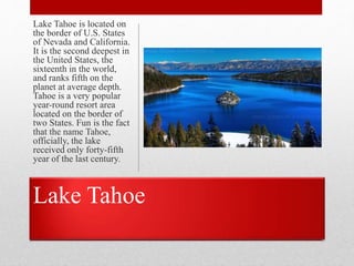 Lake Tahoe is located on the border of California and Nevada, and is the second deepest lake in the US. Tahoe is a popular resort area and received its name in the 1840s.