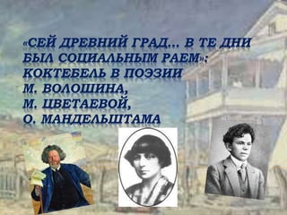 Документ содержит поэтические произведения, посвященные коктебельской тематике и вкладу М. Волошина, М. Цветаевой и О. Мандельштама в создание культурного и литературного наследия этого места. Коктебель описывается как 'обетованная земля' и 'социальный рай', где поэты находили вдохновение и духовное единство. В произведениях отражаются личные переживания и эмоциональная связь авторов с природой и жизнью в Крыму.