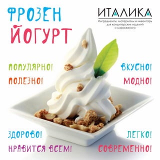 Документ описывает различные базы и рецепты для приготовления фрозен йогурта, включая их состав и дозировку. Также упоминаются популярные натуральные фруктовые пасты для придания вкуса и топпинги для украшения. В дополнение представлены формы и посуды для сервировки десертов из фрозен йогурта.
