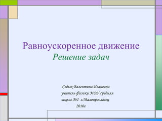 Документ содержит задачи по равноускоренному движению, включая расчеты ускорения, перемещения и проекций скорости объектов. Приведены пошаговые решения различных задач, связанных с графиками скорости и уравнениями движения. Каждая задача включает данные и методику для нахождения необходимых физических величин.