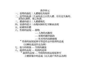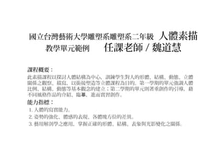本課程旨在教授學生人體素描,重點在於人體的結構、比例及動態觀察,以進一步銜接後續的塑造課程。課程分為兩個學期,第一學期專注於基本概念的建立,第二學期則引導學生透過不同風格的作品創作,提升其實踐能力及對藝術風格的理解。學生將學習人體的寫實能力、造型和諧性以及結構與形體之間的關聯,並探索如何表現性格、張力及韻律。