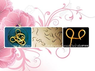 พยาธิตัวกลมต่างๆ เช่น พยาธิไส้เดือน ไส้เดือนฝอย และหนอน ในน้าส้มสายชู ลักษณะสาคัญของสัตว์ใน Phylum Nemetoda - ลาตัวกลมยาวหัวท้ายเเหลม ไม่มีรยางค์ - มีเปลือกเป็นคิวติเคิลหนาปกคลุม - สมมาตรครึ่งซีก - มีทางเดินอาหารสมบูรณ์ มีทั้งปากเเละทวารหนัก