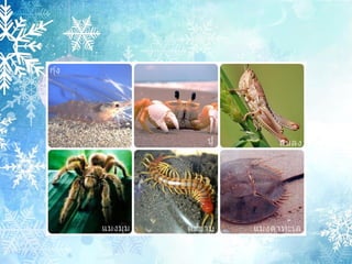 ARTHROPODA) ได้แก่ กุ้ง กั้ง ปู แมลง เห็บ ไร ตะขาบ กิ้งกือ แมงมุม แมงดาทะเล ลักษณะสาคัญของสัตว์ใน Phylum Arthropoda - มีลาตัวเป็นปล้องและมีรยางค์เป็นข้อๆต่อกัน (jointed appendage) ยื่น ออกมาจากแต่ละปล้องของลาตัว - มีจานวนชนิดมากที่สุดในอาณาจักรสัตว์ ประมาณว่ามีถึงกว่า 9 แสนชนิดที่มนุษย์ เราได้ค้นพบ - สามารถอาศัยอยู่ได้ในแทบทุกสภาพภูมิประเทศบนโลก นับว่าประสบความสาเร็จใน การดารงชีวิตบนโลกเป็นอย่างมาก เห็นได้จากการที่เราพบสัตว์เหล่านี้ได้แทบทุกหนทุกแห่ง ทุกฤดูกาล และพบเป็น จานวนมาก