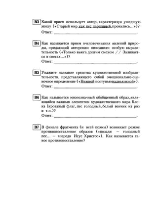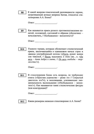 Документ обсуждает поэтическое творчество Александра Блока, выделяя его лирическую трилогию и центральную тему эпоса о прекрасной даме. Анализируются способы передачи эмоций, символики и образы, используемые поэтом, а также связь его лирики с философскими и социальными идеями. В конце документ содержит задания по пониманию стихотворений Блока и их особенностей.