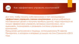 Документ рассматривает эффективное управление компаниями и необходимость изменений в системе управления для достижения долгосрочных целей и прибыли. Обсуждаются подходы к производству, включая бережливое производство и модернизацию, а также роль культуры и философии в этих процессах. Также подчеркивается важность развития производственной системы для достижения массовых и качественных результатов в бизнесе.