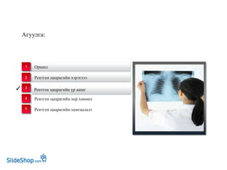 example text. Go ahead and replace it Рентген цацрагийн хамгаалалт Рентген цацрагийн хэрэглээ Рентген цацрагийн хор хөнөөл ✓ 1 2 3 4 5 Рентген цацрагийн үр ашиг