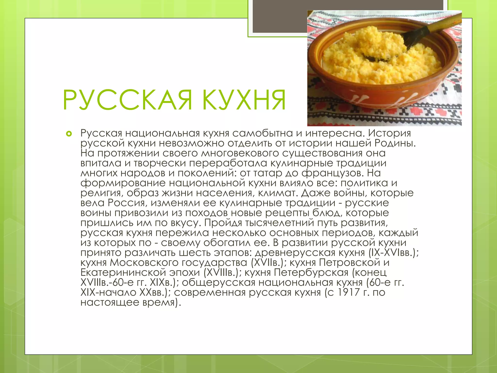 Русская кухня имеет уникальную историю, тесно связанную с развитием страны, влиянием разных народов и историческими событиями. Она включает шесть основных этапов, начиная от древнерусской кухни и до современности, с характерными блюдами и рецептурами, которые передавались из поколения в поколение. Праздничные блюда, такие как блины на масленицу и куличи на Пасху, играют важную роль в культурных традициях, отражая обрядовую кулинарию и семейные ритуалы.