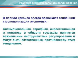 Документ обсуждает антимонопольное регулирование в России, подчеркивая его важность в условиях экономического кризиса и монополизации. Представлены меры, направленные на развитие конкуренции, улучшение тарифного регулирования и поддержку малого и среднего бизнеса. Также содержится информация о необходимости приватизации непрофильных активов госкомпаний и участии МСП в госзаказах.
