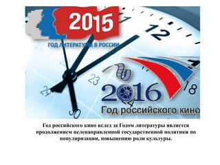 Методические рекомендации библиотекарям по проведению мероприятий в год российского кино направлены на популяризацию культурных ценностей и развитие интереса к кинематографу через разнообразные выставки и акции. Среди предлагаемых мероприятий — книжные выставки, киновечера, дискуссии и викторины, где книги и фильмы будут представлены в сравнительном контексте. Документ также включает план мероприятий на 2016 год с акцентом на взаимодействие с образовательными учреждениями и современные подходы к кинообразованию.