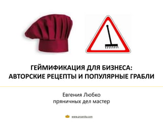 Документ описывает геймификацию для бизнеса, предлагая различные рецепты и стратегии повышения вовлеченности сотрудников через игровые механики. Основные аспекты включают постановку задач, измерение результатов, работу с бюджетом и особенности целевой аудитории. Автор подчеркивает важность четких целей и предотвращение ошибок при внедрении геймификации.