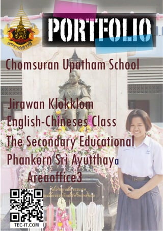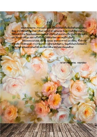 ) เล่มนี้ ดิฉันได้จัดทาขึ้นเพื่อเป็นตัวแทนนาเสนอ ข้อมูล ประวัติส่วนตัว ผลทางการศึกษา ความรู้ ความสามารถ ทักษะ รวมถึงกิจกรรมต่าง ๆ ที่ดิฉันได้เข้าร่วม โดยแฟ้มสะสมผมงานเล่มนี้ ประกอบด้วยเอกสารเกี่ยวกับประวัติส่วนตัว ประวัติทางการศึกษา ผลงานที่ได้รับที่ทาให้ดิฉันเกิดความภาคภูมิใจ เป็นต้น ดิฉันขอขอบพระคุณ คุณพ่อ คุณแม่ คุณครูอาจารย์ และเพื่อนๆ ที่ให้ความ ช่วยเหลือ ทั้งให้คาแนะนา รวบรวมเอกสาร หลักฐานสาคัญต่างๆ ข้อมูลที่เป็นประโยชน์อย่าง ยิ่งเพื่อจัดทาแฟ้มผลงานในครั้งนี้ และเพื่อการศึกษาต่อในสถาบันอุดมศึกษา (นางสาวจิราวรรณ กลมกล่อม)