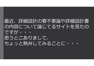 詳細設計を正しく理解している人ってあまりいないよね。 というか正しいと思える答えを聞いたことがありません。 ですから勝手ながら自分で定義してやることにしました。 こんなのでも詳細設計を行う上で何かしらの助けになることを願っています。