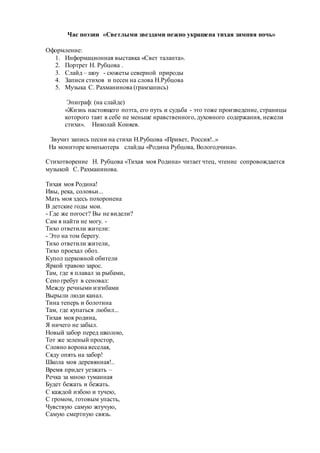 Документ представляет собой мероприятие, посвященное поэзии Николая Рубцова, организованное библиотекарем Ниной Александровной Шабалиной. В ходе мероприятия читаются стихотворения поэта, происходят обсуждения его жизни и творчества, акцентируется внимание на его связи с природой и родиной. В заключение участники исполняют песню, подчеркивающую глубокие переживания Рубцова о человеческих чувствах и отношении к окружающему миру.