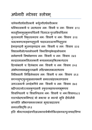 ् चाांपेयगौरार्धशरीरकायै कपपधरगौरार्धशरीरकाय र्म्ममल्लकायै च जटार्राय नमः शशवयै च नमः शशवाय ॥१॥ कस्तपररकाकु ङ्कु मचर्चधतायै र्चतारजःपुञ्जववचर्चधताय कॄ तस्मरायै ववकॄ तस्मराय नमः शशवायै च नमः शशवाय ॥२॥ चलत्क्वणत्ककङ्कणनपपुरायै पादाब्जराजत्कफणणनपपुराय हेमाङ्गदायै भुजगाङ्गादाय नमः शशवायै च नमः शशवाय ॥३॥ ववशालनीलोत्कपललोचनायै ववकाशिपङ्के रुहलोचनाय िमेक्षणायै ववषमेक्षणाय नमः शशवायै च नमः शशवाय ॥४॥ मन्दारमालाकशलतालकायै कपालमालाङ्ककतकन्र्राय ददवयाांबरायै च ददगांबराय नमः शशवायै च नमः शशवाय ॥५॥ अांभोर्रश्यामळकु न्तळायै तडित्करभाताम्रजटार्राय ननरीश्वरायै ननणिलेश्वराय नमः शशवायै च नमः शशवाय ॥६॥ रपञ्चिृष्ट्युन्मुिलास्यकायै िमस्तिांहारकताण्िवाय जगज्जनन्यै जगदेकवपत्रे नमः शशवायै च नमः शशवाय ॥७॥ रदीप्तरत्कनोज्ज्वलकु ण्िलायै स्फु रन्महापन्नगभपषणाय शशवाम्न्वतायै च शशवाम्न्वताय नमः शशवायै च नमःशशवाय॥८॥ एतत्कपठेदष्टटकशमष्टटदां यो भ्त्कया ि मान्यो भुवव दीर्धजीवी राप्नोनत िौभाग्यमनन्तकालां भपयात्किदातस्य िमस्तशिदर्र्ः॥९॥ इनत श्रीमत्कपरमहांिपररव्राजकाचायधश्रीगोववन्दभगवत्कपपज्यपादशशष्टय