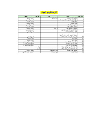 الوثيقة تتضمن قائمة بالمواد التعليمية المتنوعة الموجهة للطلاب في مراحل التعليم الأساسي. تشمل هذه المواد مواضيع متنوعة مثل الطقس، والرياضة، والبيئة، والثقافة العمانية. تحتوي القائمة على معلومات حول كل مادة وأين يمكن استخدامها في المناهج الدراسية.