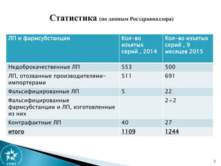 Документ описывает статистику и меры по борьбе с фальсифицированными лекарственными средствами на территории России в 2014-2015 годах. Он также касается внедрения системы маркировки и мониторинга движения лекарств, включая сроки и этапы реализации, а также финансовые и технические аспекты. В документе подчеркивается необходимость разработки совместимости кодов с европейскими регуляторами и внесения изменений в законодательство.