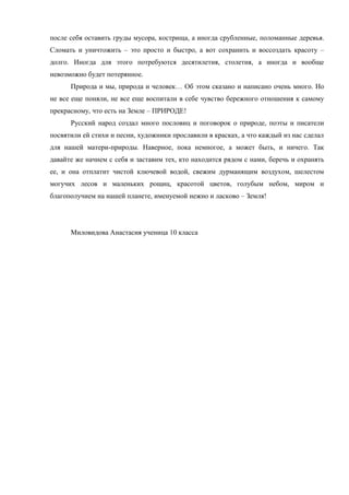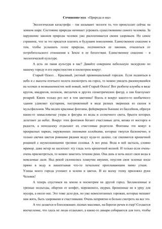Эссе под названием «Природа и мы» поднимает проблему экологической катастрофы, угрожающей существованию человека и будущим поколениям. Автор призывает к бережному отношению к природе и развитию экологической культуры, описывая как красивую природу старого Оскола, так и загрязненные районы, демонстрируя контраст. В конце автор обращается к личной ответственности каждого за сохранение природы и её богатств.