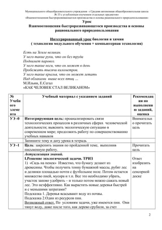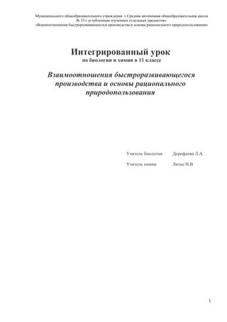 Документ представляет собой методические материалы для интегрированного урока по биологии и химии, посвящённого взаимосвязям быстроразвивающегося производства и основам рационального природопользования. В нем рассматриваются цели урока, задания для учеников и подходы к оценке знаний, а также поднимаются вопросы экологической ответственности и рационального использования природных ресурсов. Учителями предусмотрены взаимодействия между учениками и активное участие в обсуждении экологических и социальных проблем, связанных с деятельностью человека.