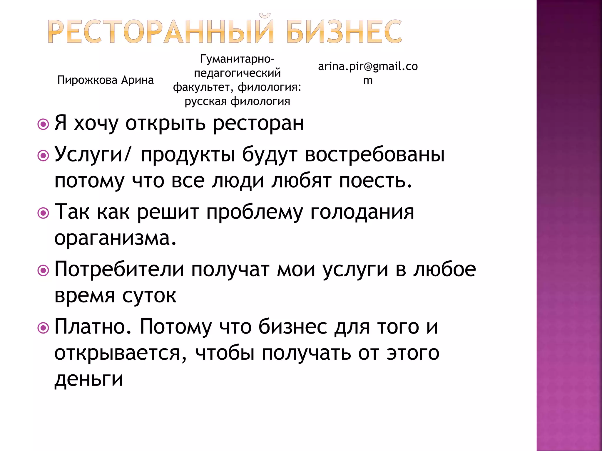 Автор хочет открыть три бизнеса: ресторан, супермаркет и магазин одежды, все из которых будут востребованы, так как люди всегда нуждаются в еде и одежде. Эти бизнесы решат проблемы голодания и нехватки одежды, предлагая услуги и товары круглосуточно. Все предложения направлены на получение прибыли.