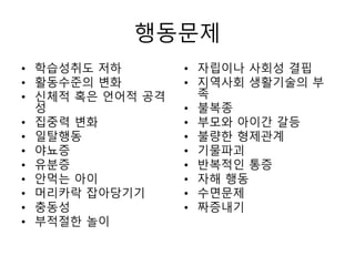 • 61개월-취학전: 야뇨증, 유아원 거부, 침을 뱉거나 괴상한 소리를 내