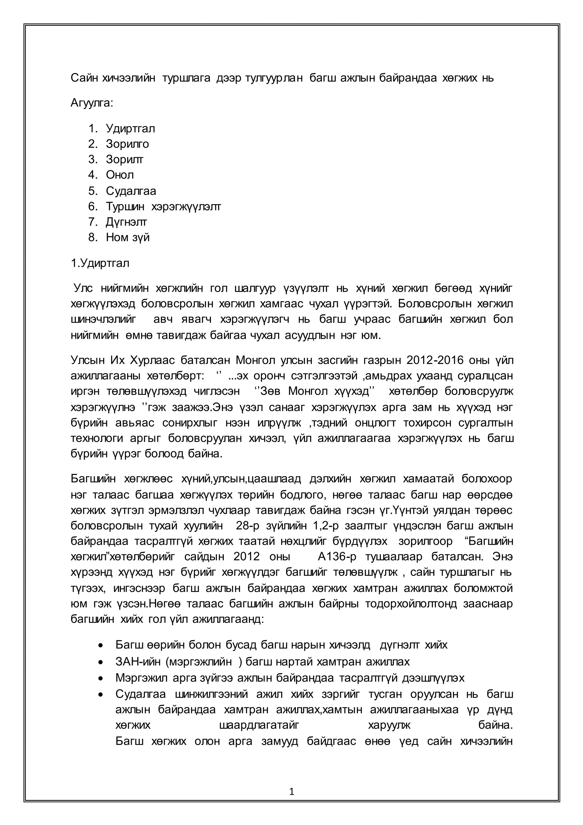 дээр тулгуурлан багш ажлын байрандаа хөгжих нь Агуулга: 1. Удиртгал 2. Зорилго 3. Зорилт 4. Онол 5. Судалгаа 6. Туршин хэрэгжүүлэлт 7. Дүгнэлт 8. Ном зүй 1.Удиртгал Улс нийгмийн хөгжлийн гол шалгуур үзүүлэлт нь хүний хөгжил бөгөөд хүнийг хөгжүүлэхэд боловсролын хөгжил хамгаас чухал үүрэгтэй. Боловсролын хөгжил шинэчлэлийг авч явагч хэрэгжүүлэгч нь багш учраас багшийн хөгжил бол нийгмийн өмнө тавигдаж байгаа чухал асуудлын нэг юм. Улсын Их Хурлаас баталсан Монгол улсын засгийн газрын 2012-2016 оны үйл ажиллагааны хөтөлбөрт: ‘’ ...эх оронч сэтгэлгээтэй ,амьдрах ухаанд суралцсан иргэн төлөвшүүлэхэд чиглэсэн ‘’Зөв Монгол хүүхэд’’ хөтөлбөр боловсруулж хэрэгжүүлнэ ’’гэж заажээ.Энэ үзэл санааг хэрэгжүүлэх арга зам нь хүүхэд нэг бүрийн авьяас сонирхлыг нээн илрүүлж ,тэдний онцлогт тохирсон сургалтын технологи аргыг боловсруулан хичээл, үйл ажиллагаагаа хэрэгжүүлэх нь багш бүрийн үүрэг болоод байна. Багшийн хөгжлөөс хүний,улсын,цаашлаад дэлхийн хөгжил хамаатай болохоор нэг талаас багшаа хөгжүүлэх төрийн бодлого, нөгөө талаас багш нар өөрсдөө хөгжих зүтгэл эрмэлзлэл чухлаар тавигдаж байна гэсэн үг.Үүнтэй уялдан төрөөс боловсролын тухай хуулийн 28-р зүйлийн 1,2-р заалтыг үндэслэн багш ажлын байрандаа тасралтгүй хөгжих таатай нөхцлийг бүрдүүлэх зорилгоор “Багшийн хөгжил”хөтөлбөрийг сайдын 2012 оны А136-р тушаалаар баталсан. Энэ хүрээнд хүүхэд нэг бүрийг хөгжүүлдэг багшийг төлөвшүүлж , сайн туршлагыг нь түгээх, ингэснээр багш ажлын байрандаа хөгжих хамтран ажиллах боломжтой юм гэж үзсэн.Нөгөө талаас багшийн ажлын байрны тодорхойлолтонд зааснаар багшийн хийх гол үйл ажиллагаанд: Багш өөрийн болон бусад багш нарын хичээлд дүгнэлт хийх ЗАН-ийн (мэргэжлийн ) багш нартай хамтран ажиллах Мэргэжил арга зүйгээ ажлын байрандаа тасралтгүй дээшлүүлэх Судалгаа шинжилгээний ажил хийх зэргийг тусган оруулсан нь багш ажлын байрандаа хамтран ажиллах,хамтын ажиллагааныхаа үр дүнд хөгжих шаардлагатайг харуулж байна. Багш хөгжих олон арга замууд байдгаас өнөө үед сайн хичээлийн