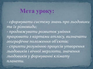 - сформувати системузнань про льодовики