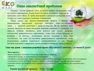 Девіз колективу: «Земля не належить людині, людина належить Землі». В учнях виховували дбайливе гуманне і духовне ставлення до природи, яке викликає яскраві і позитивні емоції, щоб кожний учень спроможний був бачити і усвідомлювати себе частиною світу природи. Так, діти виготовляли книжки з екологічними казками й оповіданнями, створювали місцеву Червону книгу (книги тривоги), виготовляли іграшки та аплікацій з природного матеріалу, випускали стіннівку «Природа рідного краю» та багато іншого.