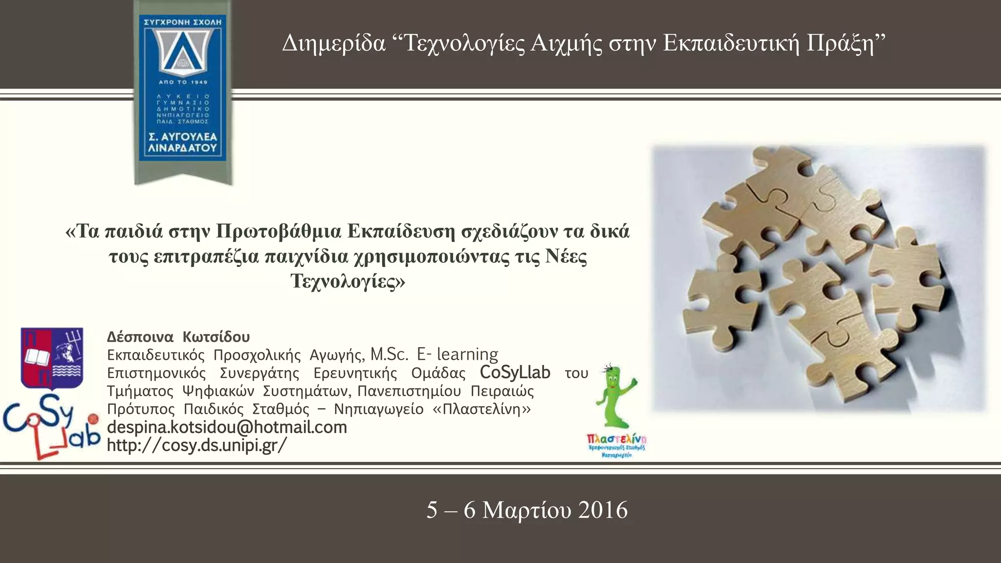 #2 Καλησπέρα σας. Είμαι η Κωτσίδου Δέσποινα, νηπιαγωγός, κάτοχος μεταπτυχιακού τίτλου E-learning και εκπροσωπώ το πρότυπο Νηπιαγωγείο «Πλαστελίνη». Ειδικότερα, θα σας παρουσιαστεί το αντικείμενο της διπλωματικής μεταπτυχιακής εργασίας με τίτλο «Τα παιδιά στην Πρωτοβάθμια Εκπαίδευση σχεδιάζουν επιτραπέζια παιχνίδια χρησιμοποιώντας τις Νέες Τεχνολογίες».