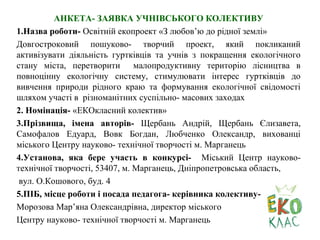 Гуртківці міського Центру науково-технічної творчості м. Марганець (Дніпропетровська область). Довгостроковий пошуково-творчий проект, який покликаний активізувати діяльність гуртківців та учнів з покращення екологічного стану міста, перетворити малопродуктивну територію лісництва в повноцінну екологічну систему, стимулювати інтерес гуртківців до вивчення природи рідного краю та формування екологічної свідомості шляхом участі в різноманітних суспільно-масових заходах.