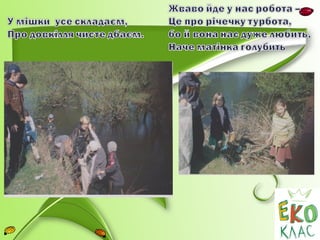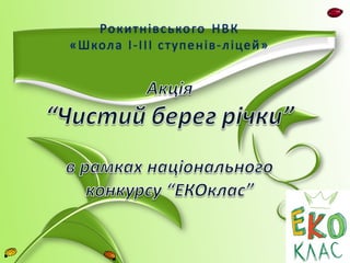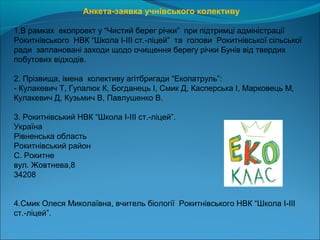 Агітбригада “Екопатруль”, Рокитнівський НВК “Школа І-ІІІ ст.-ліцей”. (Рівненська область, Рокитнівський район, с. Рокитне). Проблема якості води річки Бунів є надзвичайно важливою і потребує якнайшвидшого вирішення. Одним із основних джерел забруднення води є нагромадження великої кількості твердих побутових відходів на берегах річки, які з часом перетворюються на справжні звалища сміття. На території с. Рокитне організовано систематичний збір сміття та вивіз його в окреме місце.