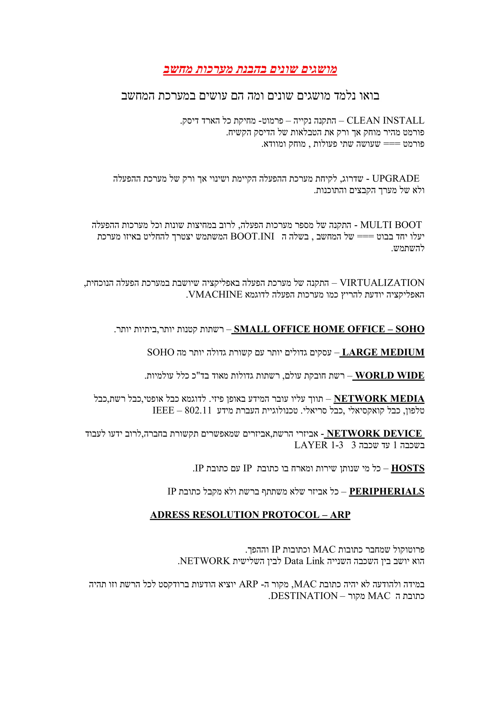 שונים המחשב במערכת עושים הם ומה שונים מושגים נלמד בואו CLEAN INSTALL–נקייה התקנה–פרמוט-.דיסק הארד כל מחיקת .הקשיח הדיסק של הטבלאות את ורק אך מוחק מהיר פורמט .ומוודא מוחק , פעולות שתי שעושה === פורמט UPGRADE-לקיח ,שדרוגההפעלה מערכת של ורק אך ושינוי הקיימת ההפעלה מערכת ת .והתוכנות הקבצים מערך של ולא MULTI BOOT-ההפעלה מערכות וכל שונות במחיצות לרוב ,הפעלה מערכות מספר של התקנה ה בשלה , המחשב של === בבוט יחד יעלוBOOT.INIמערכת באיזו להחליט יצטרך המשתמש .להשתמש VIRTUALIZATION–,הנוכחית הפעלה במערכת שיושבת באפליקציה הפעלה מערכת של התקנה לדוגמא הפעלה מערכות כמו להריץ יודעת האפליקציהVMACHINE. SOHO–SMALL OFFICE HOME OFFICE–.יותר יותר,ביתיות קטנות רשתות LARGE MEDIUM–מה יותר גדולה קשורת עם יותר גדולים עסקיםSOHO WORLD WIDE–.עולמיות כלל בד"כ מאוד גדולות רשתות ,עולם חובקת רשת NETWORK MEDIA–רשת,כבל אופטי,כבל כבל לדוגמא .פיזי באופן המידע עובר עליו תווך קואקסיאל כבל ,טלפוןימידע העברת טכנולוגיית .סריאלי ,כבלIEEE – 802.11 NETWORK DEVICE-הרשת,אביזרים אביזרילעבוד ידעו בחברה,לרוב תקשורת שמאפשרים בשכבה1שכבה עד31-3LAYER HOSTS–כתובת בו ומארח שירות שנותן מי כלIPכתובת עםIP. PERIPHERIALS–כתובת מקבל ולא ברשת משתתף שלא אביזר כלIP ARP–ADRESS RESOLUTION PROTOCOL כתובות שמחבר פרוטוקולMACוכתובותIP.וההפך השנייה השכבה בין יושב הואData Linkהשלישית לביןNETWORK. כתובת יהיה לא ולהודעה במידהMACה מקור ,-ARPתהיה וזו הרשת לכל ברודקסט הודעות יוציא ה כתובתMACמקור–DESTINATION.