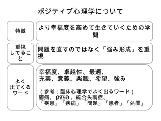 ポジティブ心理学について 特徴 重視 してるこ と より幸福度を高めて生きていくための学 問 問題を直すのではなく「強み形成」を重 視 よく 出てくる ワード 幸福度、卓越性、最適、 充実、意義、楽観、希望、強み (参考:臨床心理学でよく出るワード) 鬱病、 PTSD 、統合失調症、 「疾患」「疾病」「問題」「患者」「処置」