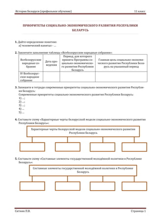 Документ представляет собой учебный материал для 11 класса по истории Беларуси, посвященный социально-экономическому развитию страны. Он включает задания на определение понятий, заполнение таблиц о всебелорусских народных собраниях и составление схемы характеристик белорусской модели развития. Основное внимание уделяется приоритетам социально-экономической политики и государственной молодежной политики Республики Беларусь.