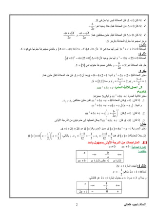 إذا0∆د ا ن». ن آ إذا0∆ =د ا نه ا وﺝ ﺕ: 2 b a − ن آ إذا0∆ه ﻡ ﺕ د ا ن: 2 b a − − ∆ و 2 b a − + ∆ ﻡ د ا ل ﻡS. ل ﻡ1: د ا2 3 2 0x x+ + =».ن( )1 4 3 2 23 0∆ = − × × = − ∆ه ﻡ وS φ=. ل ﻡ2: د ا2 10 25 0x x− + =ن و( )2 10 4 25 0 0∆ = − × = ∆ =. ا هه د:5 2 b a − =ه ﻡ و{ }5S =. ل ﻡ3: د ا2 3 2 0x x− + =ی9 4 2 1∆ = − × =أن0∆ه ﺕ د ا ه ن: 1 3 1 1 2 x − = =و2 3 1 2 2 x + = =ﻡ و{ }1;2S =. 3.ود ا ﺙ ﺙ ﺕ2 ax bx c+ +: : ود ا ﺙ ﺙ2 ax bx c+ +و∆ه ﻡ. 1.ن آ إذا:0∆ند ا2 0ax bx c+ + =ﻡ ﺕ1xو2x. ی و:( )( )2 1 2ax bx c a x x x x+ + = − − 2.ن آ إذا:0∆ =ن: 2 2 2 b ax bx c a x a + + = + 3.ن آ إذا:0∆ن:2 ax bx c+ +و ا رﺝ ا ﻡ ودی إ ﺕ ی. ل ﻡ: ودی ا( ) 2 6 1R x x x= − −ودی ا ﻡ( )R xه1 24 25∆ = + =. د ا إذن( ) 0R x =ه1 1 5 1 12 2 x + = =و2 1 5 1 12 3 x − = = −.و:( ) 1 1 6 2 3 R x x x = − + III.وا ل و ا رﺝ ا ﻡ ت اﺝ ا ا ا رة إﺵ:ax b+0a ≠ ﻡ: ل ﻡ1:درة إ2 1x + ی2 1 0x + =ی 1 2 x = − أن و2a =و0aرة إ ول ﺝ2 1x +آ ه: +∞ b a −−∞ x رة إa0رة إaax b+ +∞ 1 2 −−∞ x +0−2 1x +