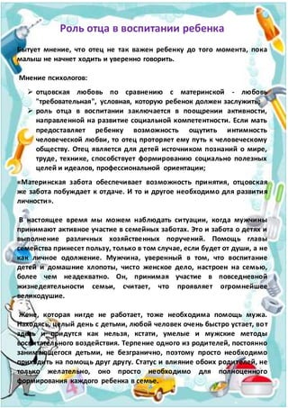 Документ обсуждает значимость отцовской роли в воспитании детей, подчеркивая, что отцовская любовь способствует развитию социальной компетентности и профессиональной ориентации. Автор отмечает, что активное участие мужчин в семейных делах необходимо для формирования уверенных и полных личностей детей. Также рассматриваются препятствия, мешающие мужчинам принимать участие в воспитании, и предлагаются способы улучшить совместное ведение домашнего хозяйства и обязательств в семье.