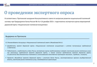 Документ содержит экспертизную оценку мероприятий дорожной карты «национальная платежная инициатива», предложенную консультативным советом при Банке России. Основное внимание уделяется доработке проекта дорожной карты, оценке затрат участников рынка и увеличению доли безналичных платежей. Определены ключевые мероприятия, такие как подготовка федеральных законов и установление налоговых льгот для стимулирования безналичных расчетов.