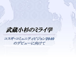 第34回「こすぎの大学〜武蔵小杉のミライ学〜」での先生役 法政大学 教授 小島聡さんによるプレゼンテーション資料です。タイトルは「武蔵小杉のミライ学~コスギ・コミュニティビジョン2040のデビューに向けて~」。(2016年3月11日開催)