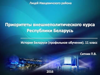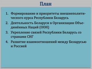 Документ описывает развитие внешнеполитического курса Республики Беларусь, включая ее интеграцию в международные организации, такие как ООН, и укрепление связей со странами СНГ, особенно с Россией. Беларусь стремится к статусу нейтрального государства и активно участвует в многосторонних международных инициативах, включая денуклеаризацию и борьбу с торговлей людьми. Основное внимание уделяется принципам независимости и равноправия в международных отношениях, а также многовекторной внешней политике страны.
