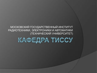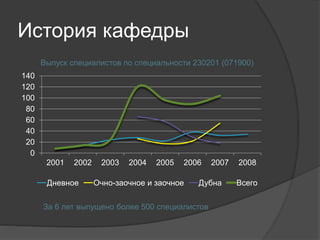 Документ описывает историю и развитие кафедры радиотехники, электроники и автоматики Московского государственного института, подчеркивая выпуск более 500 специалистов за 6 лет и рост профессорско-преподавательского состава. Также рассматривается методическое обеспечение и курсы дисциплин, внедрение информационных систем и портального строительства для улучшения образовательного процесса. Документ упоминает результаты научной работы и направления развития новых технологий в области информационных систем и образовательных программ.