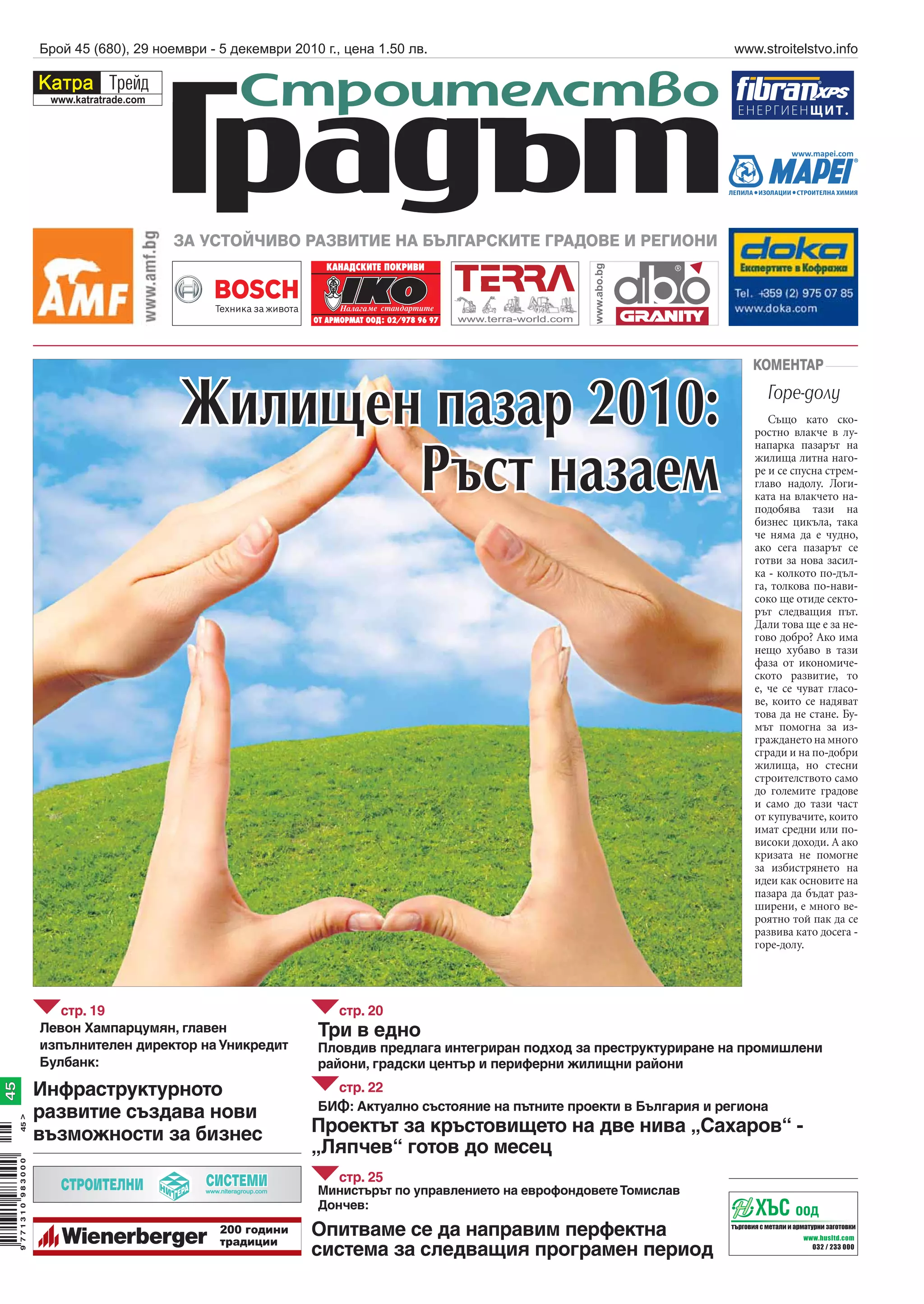 Брой 45 (680),29 ноември - 5 декември 2010 г., цена 1.50 лв. www.stroitelstvo.info